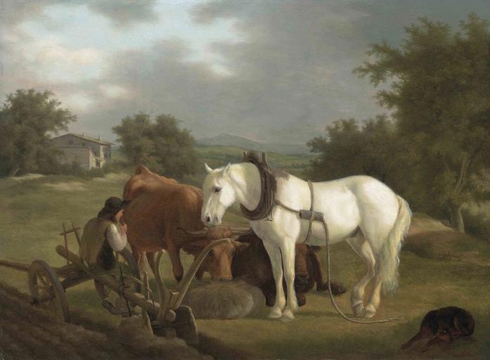 | Keywords: Jacques Laurent Agasse - A rural landscape with a ploughman resting with his grey horse, cattle and dog.jpg Artwork Creator Jacques Laurent Agasse oil panel cm 28 37 5 object history Anonymous sale; Christie's London 20 April 1990 lot 128 credit line accession number 1 http //www arcadja com/auctions/en/agasse_jacques_laurent/artist/179/ Christie's via ARCADJA auction results<br/>2 christies online 5460780 7981 175 London 6 July 2011 page no more available PD-old-100 Jacques Laurent Agasse Paintings of horses Paintings of cattle Ploughing in art |