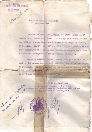 | Keywords: Jacquot elie 1941 ordre de mission general requin mars.jpg fr Ordre de mission permanent pour effectuer des recherches historiques pour tirer des enseignements des opérations de guerre signé le 21 mars 1941 par le Général d'Armée REQUIN Fond familial Scanné par Ph George en 2010 1941-03-21 Pierre Elie Jacquot |