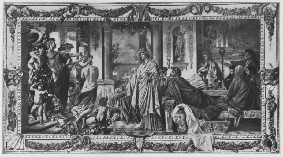 | Keywords: Jahrhundertausstellung 1906 KatNr. 0484.jpg Artwork Creator Anselm Feuerbach Gastmahl des Plato Oil Canvas cm 400 750 Nationalgalerie Berlin lt Quelle self scanned from own book Vorstand der Deutschen Jahrhundertausstellung Herausgeber žKatalog zur Ausstellung deutscher Kunst aus der Zeit von 1775 “1875 in der Königlichen Nationalgalerie Berlin Verlag F Bruckmann AG München 1906 2 Bände 1873 PD-old-70-1923 Other versions Plato ™s Symposium by Anselm Feuerbach 1873 Jahrhundertausstellung deutscher Kunst 1906 Anselm Feuerbach in Jahrhundertausstellung deutscher Kunst 1906 ImageNote 1 30 20 2594 1425 2657 1471 2 Vorherrschend die fahle gelblichweiße Fleischfarbe der eintretenden Gruppe deren Mittelfigur Alcibiades mit bordeauxfarbener Draperie umgürtet ist Der Tambourschläger in hellblauem Gewand unter dem Fell Der in der Mitte im Hintergrunde sitzende Greis in stark nach Violett zielender schokoladefarbiger Toga Agathon bräunliches Grau Weiß und Gold In der Gruppe rechts abgesehen von dem Gelb des Sokrates meist dunkle Töne Von der Vase fällt ein hellblaues Tuch in den Rahmen Der Fußboden grau in grau Die Architektur grauweiß und gold Die Säulen matte Porphyrfarbe Die Früchte des Rahmens blau und grün mit rötlichen Schatten auf Goldgrund Die Geweihe etc und die innere Leiste grau “ Bez unten links AFeuerbach 73 Das A und F monogrammiert “ Allgeyer-Neumann Nr 557 ImageNoteEnd 1 |