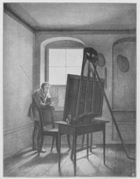 | Keywords: Jahrhundertausstellung 1906 KatNr. 0830.jpg Artwork Creator Georg Friedrich Kersting K D Friedrich in seinem Atelier c 1812 Oil on canvas cm 53 5 40 5 Nationalgalerie Berlin lt Quelle self scanned from own book Vorstand der Deutschen Jahrhundertausstellung Herausgeber žKatalog zur Ausstellung deutscher Kunst aus der Zeit von 1775 “1875 in der Königlichen Nationalgalerie Berlin Verlag F Bruckmann AG München 1906 2 Bände PD-old-100-1923 ImageNote 1 24 18 1171 1543 1226 1574 2 Die Wände in einem beschatteten bleichen Grün Der Laden des geschlossenen Fensters ist aus grauem Holz Dasselbe Grau in der Decke Die Corniche des Plafonds und die Paletten lichtes Havana Im Tisch der Staffelei und dem Fußboden nimmt das Braun eine mehr gelbliche Schattierung an Der Stuhl helles Braunrot Der Maler in heller blaugrauer Kleidung Rosa Fleisch mit weißlichen Lichtlinien Flachshaar “ Bez unten links G Kersting 18 ImageNoteEnd 1 Caspar David Friedrich in his Studio Kersting c 1812 z Jahrhundertausstellung deutscher Kunst 1906 Black and white reproductions of portrait paintings in color 1812 |