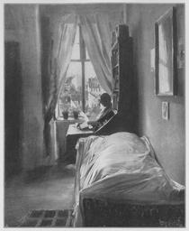| Keywords: Jahrhundertausstellung 1906 KatNr. 1145.jpg Artwork Creator Adolph von Menzel Des Künstlers Zimmer in der Ritterstraße Oil Canvas cm 56 46 Nationalgalerie Berlin lt Quelle Vorstand der Deutschen Jahrhundertausstellung Herausgeber žKatalog zur Ausstellung deutscher Kunst aus der Zeit von 1775 “1875 in der Königlichen Nationalgalerie Berlin Verlag F Bruckmann AG München 1906 2 Bände ; self scanned from own book 1847 PD-old-70-1923 Other versions Paintings by Adolph von Menzel in the Alte Nationalgalerie Jahrhundertausstellung deutscher Kunst 1906 Adolph von Menzel in Jahrhundertausstellung deutscher Kunst 1906 ImageNote 1 21 21 1260 1546 1300 1586 2 Der Fußboden und die linke Wand helles Braun Der Teppich stärkeres Braun mit schwarzen Flecken und weißgrauen Streifen Wo die tonreiche blaue Gardine hängt ist die Wand ein gemildertes Rosa mit schwachem Zusatz von Blau ebenso die rechte Wand Die Bilder mit grauweißen Reflexen gelb gerahmt Das Bett weißgrau mit weißen Lichtern; in den Schatten kehrt das Rosa der Wand wieder Das Weißgrau bildet die Reflexe des Möbels Die rote Farbe kommt in dem skizzenhaften wohl nachträglich zugefügten Mann wieder und modifiziert in den Dächern der weißen Häuser Lebhaftes Grün zwischen den Häusern Der Himmel weißgrau “ Bez unten rechts grau A M 47 v Tschudi Menzel-Werk Nr 35 ImageNoteEnd 1 |