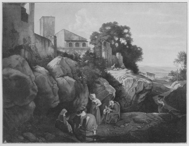| Keywords: Jahrhundertausstellung 1906 KatNr. 1424.jpg Artwork Creator Ludwig Richter Ariccia Oil Canvas cm 59 77 Kgl Gemäldegalerie Dresden lt Quelle Vorstand der Deutschen Jahrhundertausstellung Herausgeber žKatalog zur Ausstellung deutscher Kunst aus der Zeit von 1775 “1875 in der Königlichen Nationalgalerie Berlin Verlag F Bruckmann AG München 1906 2 Bände ; self scanned from own book 1828 PD-old-70-1923 Other versions Ludwig Richter Jahrhundertausstellung deutscher Kunst 1906 Galerie Neue Meister Dresden ImageNote 1 18 18 1696 1300 1736 1343 2 Die grauen Felsen mit braunen Schatten In den Kostümen gedämpftes Purpur Blau Braun etc Rosabraunes Fleisch Architektur gebräuntes Grau Rotbraune Einzelheiten Das Graublau der Ferne nähert sich der Farbe des Himmels Gelblichgraue Wolken “ Bez unten rechts schwarz L Richter pinx Meißen 1828 ImageNoteEnd 1 |