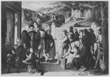 | Keywords: Jahrhundertausstellung 1906 KatNr. 1569.jpg Artwork Creator Julius Schnorr von Carolsfeld Der hl Rochus Oil Canvas cm 91 128 Städtisches Museum Leipzig lt Quelle Vorstand der Deutschen Jahrhundertausstellung Herausgeber žKatalog zur Ausstellung deutscher Kunst aus der Zeit von 1775 “1875 in der Königlichen Nationalgalerie Berlin Verlag F Bruckmann AG München 1906 2 Bände ; self scanned from own book 1817 PD-old-70-1923 Other versions Paintings by Julius Schnorr von Carolsfeld Jahrhundertausstellung deutscher Kunst 1906 ImageNote 1 15 15 1646 1141 1682 1177 2 Vorwiegend das Schwarz der Talare auf der linken Seite neben der schwarzgrauen Architektur Die Betenden in Dunkelrot Dunkelblau Dunkelolivebraun Rechts die Frau mit dem Kind in orangebraunem Rock; Mieder und Kopftuch braunrot Dasselbe Rotbraun nur noch beschatteter in dem sitzenden Greise Die Mönche dahinter dunkelbraun die Nonne grün Der Jüngling vor ihr in Schwarz der vorderste in blauem Mantel mit grünem Kragen und rotbrauner Mütze Die Fleischtöne braun fast ohne Rosa Die Mauer hellgrau In der Landschaft graue Felsen mit Grün und Braun Hellblauer Himmel mit grauen Wolken “ Bez rechts auf dem steinernen Pfeiler grau Monogramm J S zwischen 18 und 17 ImageNoteEnd 1 |