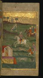 | Keywords: Jalal al-Din Rumi, Maulana - A Prince Returning from a Hunt and a Woman in a Pavilion - Walters W6262B - Full Page.jpg  This folio from Walters manuscript W 626 is the right side of a double-page illustrated frontispiece introducing the 1st book daftar of the Masnavi A prince is shown on horseback with a gesture of surprise as a woman waits in a pavilion islamic 1663 1073 ink and pigments on thin laid paper probably Kashmiri cm 26 5 15 accession number W 626 2B 83724 Ibrahim date and mode of acquisition unknown round seal impression Ibrahim on front flyleaf iia Henry Walters Baltimore date and mode of acquisition unknown Walters Art Museum Henry Walters Acquired by Henry Walters place of origin Bharat Walters Art Museum license 2D Manuscript by Rumi Walters MS 626 Media contributed by the Walters Art Museum needs category review |