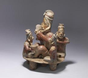 | Keywords: Jalisco - Feasting Scene - Walters 482768 - Left Side.jpg The Feasting Scene constitutes a unique sculptural ceramic of exceptional quality produced by the Jalisco ceramicists of ancient West Mexico Four female figures kneeling around a male figure comprise the sculptural assemblage The figures are arranged on a circular bench supported by six cylindrical legs The central figure an imposing chief or cacique holds a tube or pestle in his left hand and an hacha or ceremonial axe in his upraised right hand One female figure directly facing the cacique holds a small shallow bowl in her right hand and a baton in her left hand Two of the female figures rest a hand on the cacique a gesture indicating relatedness A third figure to the cacique's right rests one hand on the chief's shoulder and the other on his elbow The assemblage has been painted with a red and cream clay slip; details on each of the figures are rendered in resist-paint Conventional to the Jalisco figural style are elongated faces full rounded legs and torsos erect posture and vacant staring eyes The figures represent elite persons of West Mexico society as indicated by their ornate crested helmets shoulder scarification body and facial tattoos and ear disks Their position on a raised bench mirrors the context of circular elevated platforms characteristic of Jalisco ceremonial architecture These platforms were also painted red and white Shaft-and-chamber tombs of high-ranking families have been found below the circular structures A sculptural ceramic such as this would have been placed in mausolea of this type This sculptural assemblage likely represents an elite family feasting ritual or commemorates an ancestral tradition Such rituals involved consumption of fermented beverages by a select few Sculptures depicting group rituals are extremely rare among the corpus of West Mexico ceramics The Feasting Scene therefore represents a remarkable exception to Jalisco visual art conventions 300 BC-AD 300 Protoclassic earthenware red-slipped resist painting appliqué cm 51 4 50 2 43 2 accession number 48 2768 6954 Karl Pope Taxco Mexico 1970 Dr and Mrs George Alderman Baltimore date and mode of acquisition unknown Walters Art Museum Gift of George and Julianne Alderman 2003 place of origin Jalisco Mexico Walters Art Museum license Pottery from ancient Jalisco in the Walters Art Museum Art of Mexico Media contributed by the Walters Art Museum needs category review Jalisco ceramic figurines Scarification in art Body piercing in art |