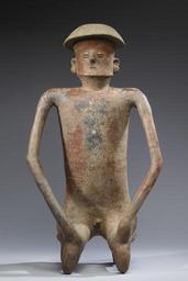 | Keywords: Jalisco - Seated Man - Walters 20092032.jpg This exceptional exploration of the human form has a number of characteristics that underscore the fact that ancient artistic styles throughout West Mexico do not conform to modern political boundaries despite our use of Mexican states to name the region's ancient cultures The facial features and figural abstraction attest to connections between the San Sebastián Red style of Jalisco and the Lagunillas pottery sculptures of adjacent Nayarit The male figure's serene countenance and seated position on a bench-throne suggest a person of high status his composed visage intimating that he is above the triviality of daily routine On the other hand his formal demeanor -arms held away from the body and hands resting securely on the knees- evokes a ritual pose like those of shamanic practices The lack of any articulation of dress-other than the earrings composed of a cluster of rounded forms-and the figure's self-possessed expression point to the interpretation of the work as an idealized portrayal of a shaman in trance 300 BC-AD 200 earthenware slip cm 63 4 36 22 5 accession number 2009 20 32 80187 Stendahl Galleries Los Angeles date and mode of acquisition unknown John G Bourne 1970s by purchase Walters Art Museum Gift of John Bourne 2009 place of origin Jalisco Mexico Walters Art Museum license Pottery from ancient Jalisco in the Walters Art Museum Art of Mexico Media contributed by the Walters Art Museum needs category review |