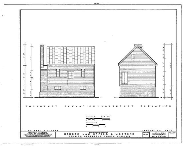| Keywords: James Monroe Law office 3a.gif en TITLE Monroe Law Office Limestone Plantation Virginia Route 250 Keswick Albemarle County VA CALL NUMBER HABS VA 2-KESW 1A- REPRODUCTION NUMBER See Call Number MEDIUM Measured Drawing s 8 18 x 24 in Data Page s 10 plus cover page DATE Documentation compiled after 1933 CREATOR Historic American Buildings Survey creator RELATED NAME S Monroe James Jefferson Thomas NOTE Survey number HABS VA-988 Unprocessed field note material exists for this structure FN-280 Building/structure dates 1794 initial construction Significance The Limestone Estate is part of the original Crawford and Lewis patents of 1731 and 1734 Subsequent owners include James Monroe his brother Andrew Thomas Jefferson and Dr George Blaetterman in whose family the property remained until the twentieth century The Monroe Law Office - the oldest residential structure - bears the date 1794 and is known to have been used by both James and Andrew Monroe The Monroe Law Office is a small three bay single pile eighteenth century wood frame structure raised on a high brick basement with a steeply pitched roof Although only one of the two original external ramped chimneys remain and numerous alterations have taken place the Monroe Law Office remains an exemplary eighteenth century Tidewater form transplanted to Piedmont Virginia SUBJECTS VIRGINIA--Albemarle County--Keswick COLLECTION Historic American Buildings Survey Library of Congress REPOSITORY Library of Congress Prints and Photograph Division Washington D C 20540 USA DIGID http //hdl loc gov/loc pnp/hhh va0069 CONTROL VA0069 LOC-image hhh va0069 Historic American Buildings Survey 1933 HABS VA 2-KESW 1A- Higher resolution JPEG uncompressed archival TIFF James Monroe Law office |