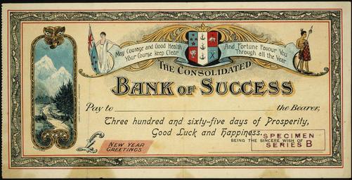 Keywords: text photo border A novelty cheque "issued" by the "Consolidated Bank of Success" and issued to the value of "three hundred and sixty-five days of Prosperity, good luck and happiness". Stamp in the lower right corner identifies this as Specimen series B. At the left there is a inset New Zealand scene of a bridge and road to a mountain, topped with a Maori tiki motif. At the top, Zealandia with the New Zealand flag, and a Maori warrior with a long spear, both flank the New Zealand coat of arms. There is a border of good luck slogans. Quantity: 1 colour art print(s). Physical Description: Coloured lithograph, with perforated left edge, 120 x 233 mm. Provenance: Transferred from Manuscripts (MS-Papers-7445-03) in 2002. May be part of the A F McDonnell papers at MS-Papers-0151. Transfers: FMSA. James Rodger & Co (Firm) :The Consolidated Bank of Success. May courage and good health your course keep clear, and fortune favour you through all the year. [Draft novelty Christmas and New Year gift cheque / printed by] James Rodger & Co. Christchurch. 191[4].. James Rodger & Co (Firm) :[Two draft novelty Christmas and New Year gift cheques / printed by] James Rodger & Co. Christchurch. 191[4].. Ref: Eph-A-CARDS-New-Year-1914-02. Alexander Turnbull Library, Wellington, New Zealand. natlib.govt.nz/records/22851347 A novelty cheque "issued" by the "Consolidated Bank of Success" and issued to the value of "three hundred and sixty-five days of Prosperity, good luck and happiness". Stamp in the lower right corner identifies this as Specimen series B. At the left there is a inset New Zealand scene of a bridge and road to a mountain, topped with a Maori tiki motif. At the top, Zealandia with the New Zealand flag, and a Maori warrior with a long spear, both flank the New Zealand coat of arms. There is a border of good luck slogans. Quantity: 1 colour art print(s). Physical Description: Coloured lithograph, with perforated left edge, 120 x 233 mm. Provenance: Transferred from Manuscripts (MS-Papers-7445-03) in 2002. May be part of the A F McDonnell papers at MS-Papers-0151. Transfers: FMSA. James Rodger & Co (Firm) :The Consolidated Bank of Success. May courage and good health your course keep clear, and fortune favour you through all the year. [Draft novelty Christmas and New Year gift cheque / printed by] James Rodger & Co. Christchurch. 191[4].. James Rodger & Co (Firm) :[Two draft novelty Christmas and New Year gift cheques / printed by] James Rodger & Co. Christchurch. 191[4].. Ref: Eph-A-CARDS-New-Year-1914-02. Alexander Turnbull Library, Wellington, New Zealand. natlib.govt.nz/records/22851347 |