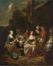 | Keywords: Jan Baptist Lambrechts - An elegant company conversing and playing tric-trac in a garden setting.jpg  Artwork Creator Jan Baptist Lambrechts 1700-1731 Oil on canvas cm 57 47 5 At Sotheby's 15 November 2015 Amsterdam lot 119<br>A pair with Servants around a table with vegetables in a garden setting accession number place of creation http //www sothebys com/en/auctions/ecatalogue/2005/old-master-paintings-am0973/lot 119 html PD-old-100 other versions PD-old-100 Jan Baptist Lambrechts Games in Flemish genre paintings Merry companies in Flemish genre paintings |