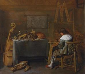 Keywords: Jan Miense Molenaer "Schilder in zijn Atelier".jpg Painter in his studio Schilder in zijn Atelier Een variatie op het vanitas thema de schilderkunst zelf die niet de eeuwige werkelijkheid weergeeft maar slechts een tijdgebonden imitatie wordt hier een vanitas-symbool net als de schedel en de kaarsen De nieuwe toeschrijving aan Molenaer is door F Meyer https //rkd nl/explore/images/23015 Rijksbureau voor Kunsthistorische Documentatie Vroeger werd het stuk toegeschreven aan Hendrik Pot De twee schedels op de voorgrond waren overschilderd en kwamen aan het licht na een restauratie in 2001 http //www museumbredius nl/schilders/pot htm Museum Bredius c 1650 Bredius Museum The Hague painting creator Jan Miense Molenaer PD-old-100 Jan Miense Molenaer Paintings of Vanitas Paintings of artists in the studio Paintings in the Bredius Museum Animal skulls |