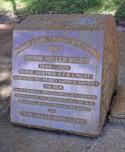 | Keywords: Jandakot Memorial SMC 2006.jpg  Memorial in Jandakot airport perth WA to The Sugar Bird Lady Robin Miller Dicks Taken by me SeanMack Robin Miller Dicks 1940-1975 was a Flying Nurse Pilot whose work for the Aborigines gained her the name of ˜Sugarbird Lady ™ She was only 35 when she died of cancer http //72 14 203 104/search q cache xZZg1xyqVT4J www berkelouw com au/file 3Fnode_id 3D5186+robin+miller+dicks+memorial hl en gl au ct clnk cd 1 2006-01-29 own assumed SeanMack Transcription center center DEDICATED TO THE MEMORY OF ROBIN MILLER DICKS 1940-1975 NURSE AVIATRIX R F D C PILOT WHO USED THE MOONEY SUPER 21 AIRCRAFT VH-REM IN HER FAMOUS ANTI-POLIOMYELITIS FLIGHTS THROUGHTOUT THE NORTHERN HALF OF W A BECOMING WIDELY KNOWN AND LOVED AS THE SUGAR-BIRD-LADY Jandakot Airport Photographs by SeanMack Royal Flying Doctor Service |