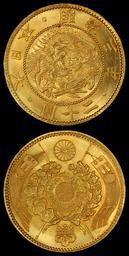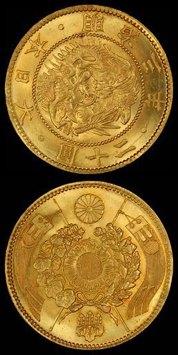 MAKE A MEME View Large Image Japan 1870 20 Yen (alt).jpg Meiji Third Year Twenty Yen Great Japan The reverse features a sunburst surrounding a sacred mirror center military banners sides the Chrysanthemum Seal top and Paulownia Crest bottom 1870 coin 2010 image ...