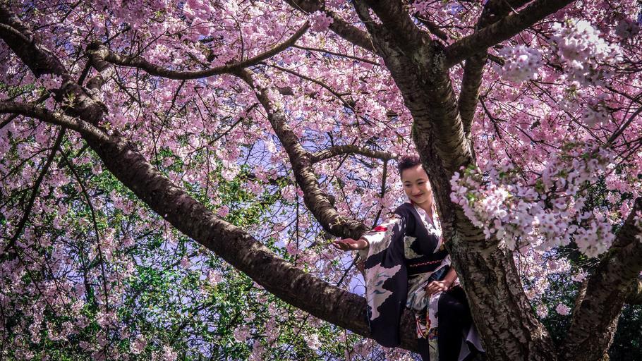 Keywords: japanese girl kimono woman cherry blossom tree bloom nature spring flowers pink