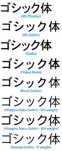 | Keywords: Japanese gothic typeface comparison.png A comparison of common en Japanese gothic typefaces MS Gothic and MS PGothic are distributed by en Microsoft with its Windows Operating System Osaka is distributed by Apple with en Mac OS X Kochi Gothic is included with many en Linux distributions Hiragino Kaku Gothic Hiragino Maru Gothic and Kozuka Gothic are distributed by Adobe These fonts come in multiple weights with both lighter and bolder versions than those shown Created with en FontExplorer X and en Adobe Photoshop on an en Apple Macintosh running OS X 10 4 Tiger Released into the public domain In Japanese MS Gothic と MS PGothic は Microsoft が提供している書体 Osaka は Apple Computer が提供している書体 風ゴシック は Linux の多くで配布されている書体 ヒラギノ角ゴシック ヒラギノ丸ゴシック 小塚ゴシックは Adobe Systems が提供している書体 en wikipedia 2006-01-18 Jacobolus wikipedia en original upload log page en wikipedia Japanese_gothic_typeface_comparison png 2006-01-18 03 26 Jacobolus 623×1500×8 36686 bytes <nowiki>A comparison of common Japanese gothic typefaces MS Gothic and MS PGothic are distributed by Microsoft with its Windows Operating System Osaka is distributed by Apple with Mac OS X Kochi Gothic is in</nowiki> text Japanese typeface samples Blackletter |