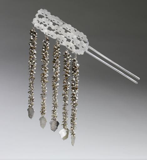 Keywords: Japanese - Hair Ornament - Walters 571341 - View A.jpg Perhaps designed to decorate the complex hairstyle of a geisha this dangling piece would lend a sparkling bit of movement to the rigid hairstyle of a young woman as she danced or sang traditional folksongs Geisha and their younger apprentices maiko continue to dress each evening in elaborate silk kimono stark white face paint and grandly jeweled hairdos or wigs in order to entertain high-paying restaurant customers in Kyoto and other metropolitan Japanese cities century 19 silver gold cm 20 8 accession number 57 1341 35517 Henry Walters Baltimore date and mode of acquisition unknown Walters Art Museum Henry Walters Acquired by Henry Walters none Bedazzled 5 000 Years of Jewelry from the Walters Art Museum Frist Center for the Visual Arts Nashville; The John and Mable Ringling Museum of Art Sarasota; The Walters Art Museum Baltimore 2006-2009 place of origin Japan Walters Art Museum license Art of Japan in the Walters Art Museum Jewellery in the Walters Art Museum Media contributed by the Walters Art Museum needs category review Kanzashi |