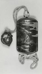 Keywords: Japanese - Inro with a Water Buffalo Family by a Winding Stream - Walters 67442.jpg A standard oblong gold lacquer three compartment inro A design all around the inro with a water buffalo cow and calf standing on the shore near a winding stream on one side and a bull on the on the other side Clouds at the top and the ground with grasses and flowers on the hilly shore The design in takamakie in gold and brown lacquer with togidashi and okibirame and the background of the natural wooden core of the inro coated with a transparent lacquer The interior is plain wood The cord channels are external Together with a carved wood netsuke in the shape of a peach with gold lacquer 1st half Other date century 19 Edo lacquer wood ivory inro cm 8 2 5 5 2 6 accession number 67 442 35859 William T / Henry Walters Collection Baltimore date and mode of acquisition unknown Walters Art Museum Henry Walters Acquired by William T or Henry Walters none Netsuke Miniature Sculpture of Japan place of origin Japan Walters Art Museum license Netsuke Miniature Sculpture of Japan Inro in the Walters Art Museum Water buffaloes in art