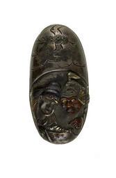 Keywords: Japanese - Kashira with Two Figures Reading a Scroll - Walters 511045.jpg A warrior and a second figure are shown looking at a scroll The warrior points to the scroll with his left hand This may be the 2nd-century Chinese General Kanyu Ch Guan Yu Kuan Yu Above the figures is a pine tree This is part of a set with Walters 51 1044 century 19 silver gold copper cm 3 4 accession number 51 1045 8053 William T / Henry Walters Collection Baltimore date and mode of acquisition unknown Walters Art Museum Henry Walters Acquired by William T or Henry Walters none place of origin Japan Walters Art Museum license Kashira in the Walters Art Museum Media contributed by the Walters Art Museum needs category review |