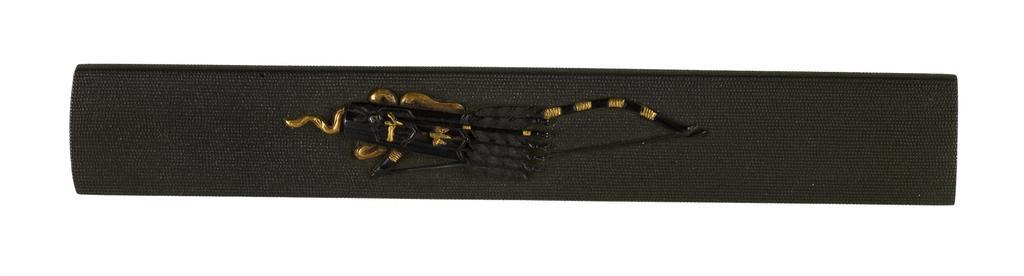Keywords: Japanese - Kozuka with Bow and Arrows - Walters 511304.jpg At the center of the kozuka are a bow and a quiver of arrows On the quiver is a paulownia crest The background has a fish egg pattern nanako-ji century 18 19 shibuichi copper gold cm 9 7 accession number 51 1304 7874 William T / Henry Walters Collection Baltimore date and mode of acquisition unknown Walters Art Museum Henry Walters Acquired by William T or Henry Walters Number Sticker with a blue border 378 place of origin Japan Walters Art Museum license Tosogu Japanese sword fittings in the Walters Art Museum Media contributed by the Walters Art Museum needs category review |