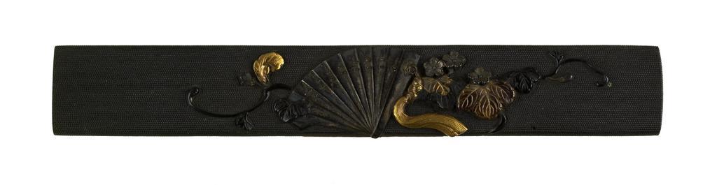 Keywords: Japanese - Kozuka with Fan and Vine - Walters 51849.jpg An open fan is in the middle of the kozuka surrounded by flowers and vines The background is in an extremely fine fish egg pattern nanako-ji century 19 Edo shakudo gold silver copper cm 9 6 l accession number 51 849 2916 William T / Henry Walters Collection Baltimore date and mode of acquisition unknown Walters Art Museum Henry Walters Acquired by William T or Henry Walters none sticker - red trellis border Japanese numbers 2 9 place of origin Japan Walters Art Museum license Kozuka in the Walters Art Museum Media contributed by the Walters Art Museum needs category review |