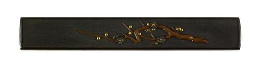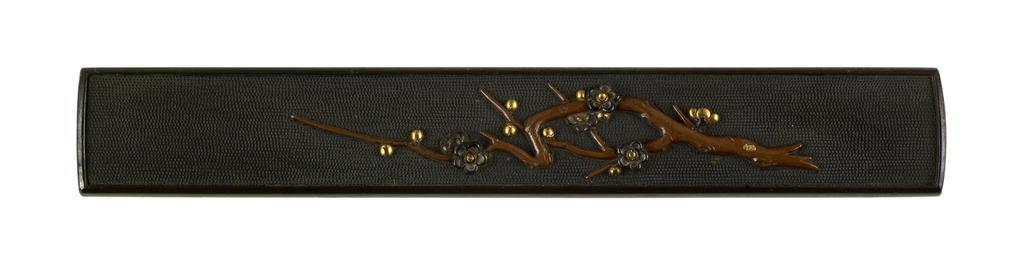 Keywords: Japanese - Kozuka with a Flowering Plum Branch - Walters 51699.jpg In the middle of the kozuka is a plum branch made of copper with several blossoms Plums are the first flower to bloom in the spring The background is made in the fish egg pattern nananko-ji and the entire kozuka is surrounding with a raised rim 18th-19th centuries Edo shakudo copper gold cm 9 5 l accession number 51 699 6732 Henry Walters Baltimore date and mode of acquisition unknown Walters Art Museum Henry Walters Acquired by Henry Walters none place of origin Japan Walters Art Museum license Kozuka in the Walters Art Museum Media contributed by the Walters Art Museum needs category review |
