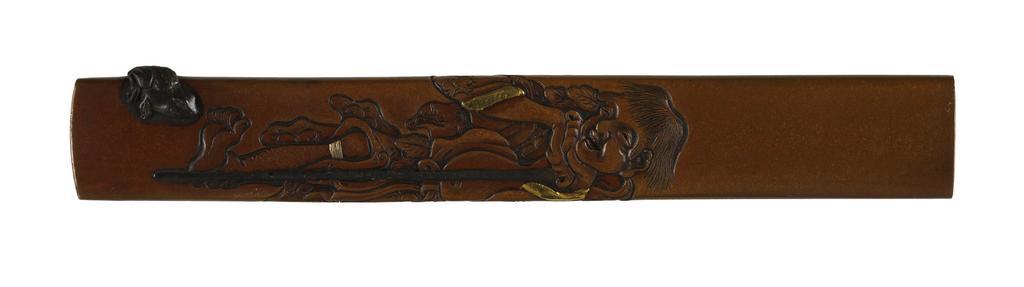 | Keywords: Japanese - Kozuka with the Taoist Immortal Gama and His Toad - Walters 51690.jpg The man shown resting on his walking stick is the Taoist immortal Gama At the bottom is a three-legged frog Gama's spirit was able to leave his body to wander and once returned to find the body unfit to reinhabit He put his spirit into the nearest creature which was a frog century 19 Edo-Meiji copper shibuichi and gold cm 9 8 accession number 51 690 14600 Henry Walters Baltimore date and mode of acquisition unknown Walters Art Museum Henry Walters Acquired by Henry Walters none place of origin Japan Walters Art Museum license Kozuka in the Walters Art Museum Media contributed by the Walters Art Museum needs category review |