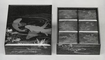 Keywords: Japanese - Set of Boxes for Storing Incense Wood - Walters 6783 - Open.jpg A black and gold lacquer rectangular ko bako with overlapping lid cusped midway on two long sides; interior with six small covered boxes On top of lid are four carp in a stream with low growth of water plants; interior boxes have designs on top of lids of streams and ponds with various groups of trees and flowers bird and butterflies; exterior sides of covered boxes with four different patterns of arabesques diaper asanoha brocade and swastika Design on top of lid in gold and brown togidashi of various shades with fish in hiramakie on gold and red lacquer; flowers in gold and red lacquer with inlaid aogai; background of black roiro with nashiji Six small interior boxes with hiramakie in gold interior and bottoms with nashiji; interior of main box with dense nashiji and applied gold and silver foils; all in highly polished lacquer rims with kinji late 19th-early 20th century Meiji lacquer aogai gold and silver foil cm 4 4 10 9 13 1 accession number 67 83 23298 World's Fair St Louis Missouri 1904 Henry Walters city Baltimore Walters Art Museum Henry Walters Acquired by Henry Walters 1904 none Imperial Japan The Art of the Meiji Era 1868-1912 Herbert F Johnson Ithaca; Munson-Williams-Proctor Arts Institute- Museum of Art Utica; Cincinnati Art Museum Cincinnati; Portland Art Museum Portland 1980-1981 place of origin Japan Walters Art Museum license Art of Japan in the Walters Art Museum Media contributed by the Walters Art Museum needs category review Carps in art KÅbako |