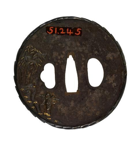 | Keywords: Japanese - Tsuba with Chinese Gentlemen and Mountain Huts - Walters 51245 - Back.jpg On the right side of this mountain two men climb towards to mountain huts at the upper right They are dressed in Chinese style clothing but the roofs of the hut are depicted as Japanese farm houses A mountain peak is shown at the upper left On the reverse a man carries a gourd on a bamboo pole This tsuba may represent a specific story or be a generalized reference to the theme of scholars visiting each other The band around the edge of the tsuba is carved in a stylized wood grain pattern date iron gold detail copper silver cm 7 2 accession number 51 245 6952 Henry Walters Baltimore date and mode of acquisition unknown Walters Art Museum Henry Walters Acquired by Henry Walters none place of origin Japan Walters Art Museum license Tsuba in the Walters Art Museum Media contributed by the Walters Art Museum needs category review |