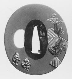 | Keywords: Japanese - Tsuba with Dancers Celebrating New Year - Walters 51241.jpg The pine tree and bamboo decorations on the right side of the tsuba are part of traditional New Year's decorations Both pine and bamboo are considered felicitous Behind the pine a rope decorated with hanging straw pendants wraps around the edge of the tsuba to the reverse side At the lower left on the front are two small figures performing a manzai dance to celebrate the New Year One beats a small drum while the other dances with a fan Both wear masks The back shows the reverse side of the decorations which appear on the front Note the unusual basket weave design on the metal plugging the hole for the hair pick on the right date shakudo gold copper cm 6 4 5 8 0 36 accession number 51 241 6886 Henry Walters Baltimore date and mode of acquisition unknown Walters Art Museum Henry Walters Acquired by Henry Walters none place of origin Japan Walters Art Museum license Tsuba in the Walters Art Museum Reliefs of dancers on Japanese sword fittings Media contributed by the Walters Art Museum needs category review Manzai comedy |