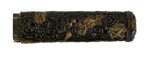 | Keywords: Japanese - Tsuka with Dragons in Clouds - Walters 5112193B.jpg Three gold dragons emerge from clouds on the tsuka One is on the kashira and one is on either side of the handle Other than the kashira the tsuka is worked in a single piece of metal without menuki or wrapping This is part of a mounted set century 18 Edo wood iron silver sentoku gold cm 14 5 accession number 51 1219 3B 79606 Henry Walters Baltimore date and mode of acquistion unknown Walters Art Museum Henry Walters Acquired by Henry Walters none place of origin Japan Walters Art Museum license Tsuka in the Walters Art Museum Media contributed by the Walters Art Museum needs category review |