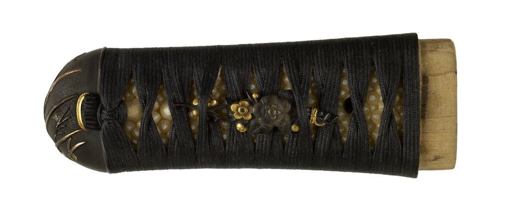 | Keywords: Japanese - Tsuka with Flowers - Walters 5112173B - Back.jpg The kashira is decorated with pampas grass which is one of the celebrated autumn flowers The two menuki are in the shape of blossoming plum branches Plum is the first tree to flower in the spring This is part of a mounted set 18th-19th centry Edo silver gold shibuichi ray skin silk cord wood cm 10 9 accession number 51 1217 3B 79604 Henry Walters Baltimore date and mode of acquistion unknown Walters Art Museum Henry Walters Acquired by Henry Walters none place of origin Japan Walters Art Museum license Tsuka in the Walters Art Museum Media contributed by the Walters Art Museum needs category review |