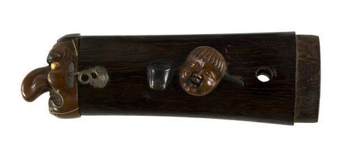 Keywords: Japanese - Tsuka with Masks - Walters 5111873B - Back.jpg Three masks probably for use in comic plays kyôgen are shown on this tsuka The kashira is a long-nosed tengu demon mask The menuki are masks for sake-loving shôjô Behind each mask is a sake ladle This is part of a mounted set century 19 Edo-Meiji black lacquer stained wood copper alloy silver gold cm 11 9 accession number 51 1187 3B 79341 William T / Henry Walters Collection Baltimore date and mode of acquisition unknown Walters Art Museum Henry Walters Acquired by William T or Henry Walters none place of origin Japan Walters Art Museum license Tsuka in the Walters Art Museum Media contributed by the Walters Art Museum needs category review