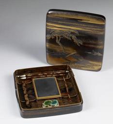 Keywords: Japanese - Writing Box and Implements (suzuri bako) with a Pheasant Beside a Stream - Walters 6775 - Open C.jpg Implements inside the box A rectangular inkstone with a depression for water is positioned in the center of the box On the right side are brushes and a stylus while on left is an encased knife used to cut paper The enamel piece above in the shape of hollyhock leaves is a water-dropper An ink stick sumi would have been included in the set The sumi is a small stick of solid ink that is turned into usable ink by grinding it on the inkstone and adding water Lid with pheasant beside a stream The inlaid silver Japanese text on the lid is a partial line from a poem in Lady Murasaki Shikibu's early 11th-century novel The Tale of Genji In chapter 29 The Royal Outing the emperor invites Genji to go hunting in the mountains outside Kyoto Genji sends his regrets that he cannot join the royal party The emperor decides to send Genji a couple of pheasants with the following poem attached Deep in the snows of Mount Oshio Are ancient pheasants' tracks Would that you might see them The box makes a poignant reference to this classical poem as it holds the tools of a poet century 18 19 Edo; Meiji box wood lacquer silver mother-of-pearl gold; paint brushes wood lacquer animal hair; water dropper silver enamel; stylus wood lacquer steel; knife wood lacquer steel; ink stone slate Lid cm 2 54 21 27 22 86 ; Bottom cm 3 81 21 27 22 86 accession number 67 75 21270 Henry Walters Baltimore date and mode of acquisition unknown Walters Art Museum Henry Walters Acquired by Henry Walters Japanese Lacquers The Walters Art Gallery Baltimore 1984 place of origin Japan Walters Art Museum license Art of Japan in the Walters Art Museum Suzuri bako