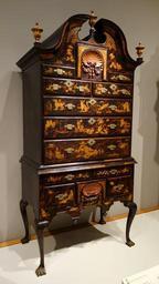 | Keywords: Japanned high chest, signed in chalk 'Pim', case by John Pimm, Boston, Massachusetts, 1740-1750, soft maple, black walnut, white pine, mahogany, paint, gesso, original brass, view 1 - Winterthur Museum - DSC01398.JPG en Exhibit in the Winterthur Museum New Castle County Delaware USA Photography was permitted in the museum without restriction This work is in the public domain because the artist died more than 70 years ago 2013-05-08 10 54 00 own Daderot cc-zero Furniture in Winterthur Museum Uploaded with UploadWizard American Queen Anne style furniture High chests of drawers |