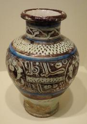 | Keywords: Jar with calligraphic decoration in kufic script, Syria, Rakka, Ayyubid period, late 12th or early 13th century, earthenware w. underglaze blue painting, transparent glaze, luster - Cincinnati Art Museum - DSC04030.JPG  en Exhibit in the Cincinnati Art Museum Cincinnati Ohio USA This artwork is in the public domain because the artist died more than 70 years ago Photography was permitted in the museum without restriction 2013-05-14 11 20 00 own Daderot cc-zero Ayyubid pottery in the Cincinnati Art Museum Uploaded with UploadWizard Kufic style |