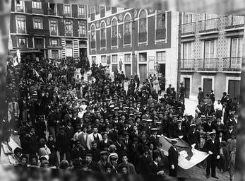 | Keywords: JBN001469 - Bando precatório dos estudantes a favor das vítimas do terramoto de Benavente.jpg Bando precatório dos estudantes a favor das vítimas do terramoto de Benavente - Rua da Misericórdia Semelhante à publicada na Ilustração Portuguesa 1909 14 de Junho Ref A8936 commonist Institution Arquivo Municipal de Lisboa http //arquivomunicipal cm-lisboa pt/sala/online/ui/searchbasic aspx search _OB 2b_QT MFN__Q 197716_EQ T_D T___ type PCD mode 0 page 0 res 0 Colecção Benoliel Arquivo Municipal de Lisboa 1909-06 Creator Joshua Benoliel PD-old-auto-1923 1932 Rua da Misericórdia Photos of Lisbon uploaded by Darwinius Teatro da Trindade Telecommunication companies Telecommunications in Portugal Students charity fundraising for the victims of the 1909 Benavente earthquake Ilustração Portuguesa Images from the Arquivo Municipal de Lisboa Photographs by Joshua Benoliel Historical flags of Portugal 1830-1910 Azulejo facades in Lisbon Street lights in Lisbon Black and white photographs of Lisbon trams Lisbon trams with unknown fleet number 203-282 Brill Lisbon trams facing right Lisbon trams in 1909 Lisbon trams in the background Partial views of Lisbon trams People with flags Hair dressing shops |