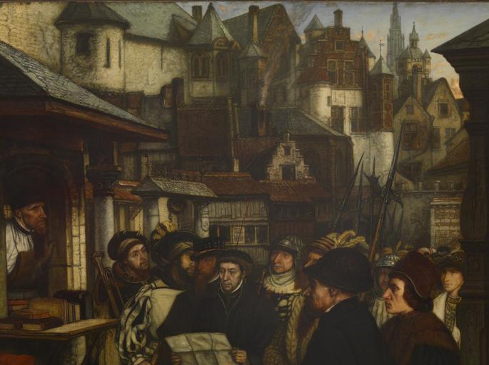 Keywords: Jean August Hendrik Leys - The Edict-s- of Charles V - Walters 37123 - Detail F.jpg Baron Leys was regarded as Belgium's foremost artist in the mid 19th century About 1851 he adopted a deliberately archaizing style resulting in part from a visit to Germany in 1852 This scene is set in the artist's native Antwerp identifiable because of the famous church spire in the distance Between 1520 and 1550 Charles V emperor of the Holy Roman Empire issued 11 edicts making the practice of Protestantism a crime punishable by death Antwerp served as a major center of learning and finance that had attracted many foreigners especially Jews and Protestants ca 1861 oil on panel cm 138 245 ; Framed cm 182 9 280 7 12 7 accession number 37 123 7985 Comte W de Bourgade date and mode of acquisition unknown Comte de Liedekerke-Beaufort Dinant date and mode of acquisition unknown Charles Deschamps October 24 1883 mode of acquisition unknown William T Walters Baltimore October 1883 by purchase Henry Walters city Baltimore Walters Art Museum Henry Walters Acquired by William T Walters 1883 Label Paper sticker on reverse Exhibition Historique de l'art Belge / Nom de possesseur du tableau Cte W de Bourgade / Subjet de l'oeuvre Publication des edits de Charles Quint / Valeur / Nom de l'auteur Bon Leys Salute to Belgium place of origin Picardy Walters Art Museum license 2D Salute to Belgium The Edicts of Charles V Media contributed by the Walters Art Museum needs category review Paintings in the Walters Art Museum |