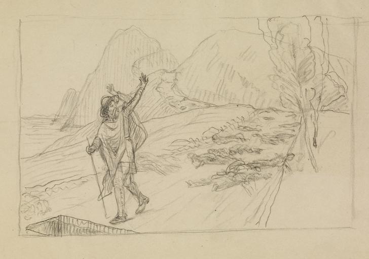 Keywords: Jean-Léon Gérôme - Man Walking on a Road - Walters 372798.jpg A bearded man in the costume of an ancient Greek traveler trudges down a road through a mountainous landscape In front there is a deep crevice and behind him are strewn corpses The drawing may show an episode from the Bible but the specific subject of this melancholic scene has yet to be identified between 1890 1899 pencil on thin beige paper some ink Drawing cm 15 24 23 5 ; Sheet cm 22 86 31 75 accession number 37 2798 79176 Joseph F McCrindle 1923-2008 New York B0012 Joseph F McCrindle Foundation New York 2008 by bequest Walters Art Museum Gift of the Joseph F McCrindle Collection 2009 Marks Gr on center bottom of drawing Expanding Horizons Recent Additions to the Drawings Collection The Walters Art Museum Baltimore 2010 place of origin France Walters Art Museum license 2D Drawings by Jean-Léon Gérôme Media contributed by the Walters Art Museum needs category review Drawings in the Walters Art Museum |