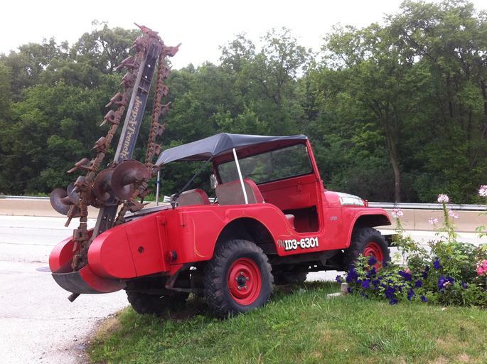 Keywords: Jeep-A-Trench on a CJ-5 rr.jpg en A Jeep CJ-5 with the Jeep-A-Trench accessory The trencher too big for the Jeep to do the job This works well on a farm http //www youtube com/watch v ze06ANMNAws watch youtube The setup is designed with the controls of the trencher and so that the vehicle can be driven by standing outside the left rear corner of the Jeep The trencher package had coil spring overloads in addition to the leaf spring packs while the tires were 7 50x16 instead of the standard 6 00x16 Optional was a dual rear wheel set up More information on this is http //www film queensu ca/cj3b/Literature/JeepATrench html here Specification on this and many more Jeep work equipment are http //www vintagejeepparts com/jeep_legend_jeepatrench asp here own 2011-08-02 CZmarlin ” Christopher Ziemnowicz releases all rights but a photo credit would be appreciated if this image is used anywhere other than Wikipedia Please leave a note at Wikipedia http //en wikipedia org/w/index php title User_talk CZmarlin action edit section new here Thank you 42 12 72 0 N 87 50 43 0 W alt 195 507042_source exif_heading 80 190789 Jeep CJ-5 Chain trenchers