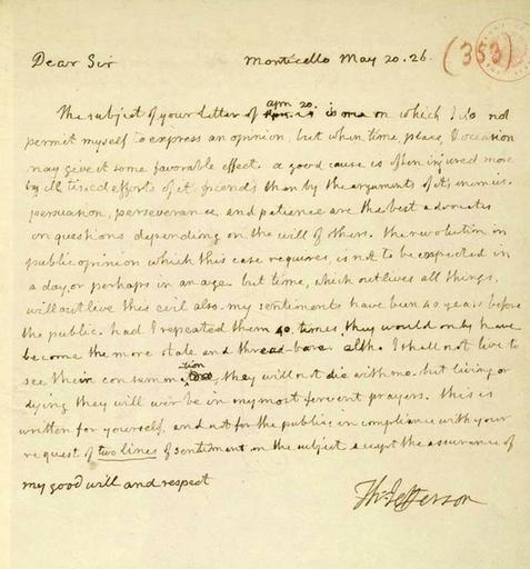 Keywords: Jefferson Heaton letter 1826.jpg <big>Thomas Jefferson</big> to <big>James Heaton</big> May 20 1826 ---- <big>Jefferson's public silence on slavery </big><br> In a letter to James Heaton Whig state representative from Ohio Thomas Jefferson explained his public stance on slavery Near the end of his life Jefferson justified his inaction for trying to end slavery during his presidency with the following explanation in a letter to James Heaton <ref> cite web Library of Congress Thomas Jefferson Legacy July 25 2014 http //www loc gov/exhibits/jefferson/jeffleg html </ref><br><br> <big>DEAR SIR -- Monticello May 20 26<br><br>The subject of your letter of April 20 is one on which I do not<br>permit myself to express an opinion but when time place and occasion<br>may give it some favorable effect A good cause is often injured more<br> by ill-timed efforts of its friends than by the arguments of its enemies <br>Persuasion perseverance and patience are the best advocates<br>on questions depending on the will of others The revolution in<br>public opinion which this cause requires is not to be expected in<br>a day or perhaps in an age; but time which outlives all things <br>will outlive this evil also My sentiments have been forty years before<br>the public Had I repeated them forty times they would only have<br>become the more stale and threadbare Although I shall not live to<br>see them consummated they will not die with me; but living or<br>dying they will ever be in my most fervent prayer This is<br>written for yourself and not for the public in compliance with your<br>request of two lines of sentiment on the subject Accept the assurance of<br>my good will and respect </big><br> -- <big>Thomas Jefferson </big><br><br> <small>Note</small> <references/> ---- May 20 1826 Library of Congress Thomas Jefferson PD-Art PD-old-100 Uploaded with UploadWizard Letters by Thomas Jefferson Letters of the United States |