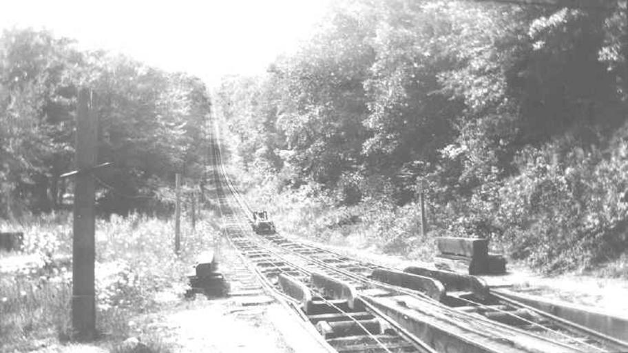 | Keywords: Jefferson plane looking up.jpg w Mauch Chunk and Summit Hill Switchback Railroad <tt><big> </big></tt> looking up the Jefferson plane Jefferson Summit of Pisgah Mountain Carbon County Pennsylvania from the approximate position of the capture latch Depicted to the right is the cable-attached pusher cart known as a 'Barney' The Barney's all had telescoping axles and a set of double flanged wheels which caught a guide shoe leading to a narrower interior track one flange collapsing the Barney's axles inside that of the main car track which passed over and outside the barney hatches So configured it could travel into one of the two openings shown and travel around the large diameter winch pulley to re-emerge out the other side This is an in-between non-terminus 'relative lift bottom' where the track leading in behind the camera is at the bottom of a seven mile descending incline from Mount Pisgah Carbon County Pennsylvania Mount Pisgah terminated by the slight rise at the position of the camera and winch Beyond the bump of the winch hump this view shows a staging area before a latch brake designed to hold any train slowing as it tops the winch house for the positioning of the Barney to emerge behind it and couple The Barney coupled train is then released and advances on the cable into the slight drop below to climb the long ascent up the Jefferson Plane to surmount a final summit detach from the Barney in a similar hump then drop as if a gravity railroad to the Summit Hill station or switching network The system could be run in funicular mode but this was seldom used <br><hr> <tt><big> </big></tt> The switchback part of the railroad name refers to parts not depicted an auxiliary spur with its own cable incline and gravity railroad descent through a clever succession of automatic self-acting switchbacks used solely for coal transport the founding purpose for the railroad that ended its long life as an amusement ride These switchbacks were abandoned after the 1872 opening of the Hauto Tunnel but the name stuck as part of the legal documents when the railroad was sold to new owners for its life as a tourist railroad http //www gingerb com/CNJ 20Mauch 20Jefferson 20Plane 20- 20looking 20up jpg http //www gingerb com/CNJ 20Mauch 20Jefferson 20Plane 20- 20looking 20up jpg 1893 Public domain PD-old PD-US Carbon County Pennsylvania Mauch Chunk Switchback Railway Funiculars in the United States |