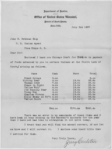 | Keywords: Jerry Carleton to John R. Brennan - NARA - 285004.tif Scope and content This is document pertains to Murder of Pugh Brave Heart April 12 1907 to July 3 1907 General notes Account of funds advanced to Indians appearing at Pierre South Dakota court 285004 Local identifier Department of the Interior Office of Indian Affairs Pine Ridge Agency 1878 - 09/17/1947 NARA's Central Plains Region Kansas City NREA 400 West Pershing Road Kansas City MO 64108 1907-07-03 Record group Record Group 75 Records of the Bureau of Indian Affairs 1793 - 1999 Record group ARC 404 Records of Controversies compiled 04/01/1867 - 1879 Series ARC 284971 File unit Murder of Pugh Brave Heart 04/12/1907 - 07/03/1907 File unit ARC 284989 Variant control numbers NAIL Control Number NRE-75-67-BB-15 yes Other versions NARA-cooperation PD-USGov Documents in English |