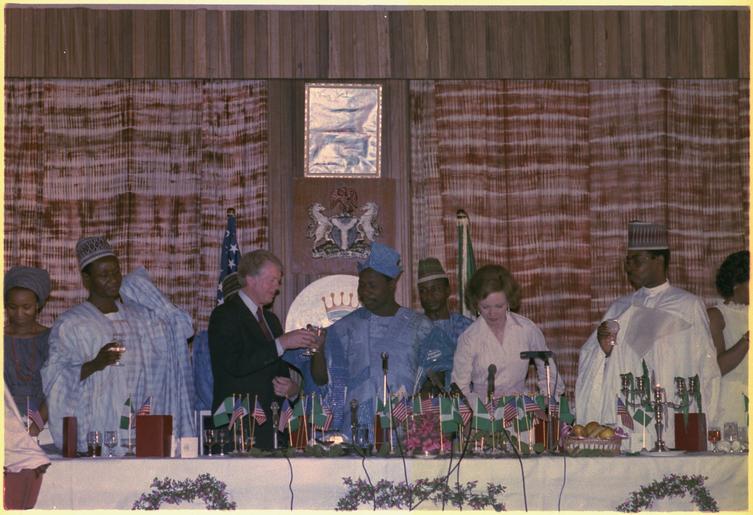 | Keywords: Jimmy Carter and President William Tolbert of Liberia engage in a toast during a state dinner in honor of Jimmy... - NARA - 178722.tif Scope and content General notes 178722 Local identifier President 1977-1981 Carter White House Staff Photographers 01/20/1977 - 01/20/1981 Jimmy Carter Library NLJC 441 Freedom Parkway Atlanta GA 30307-1498 1978-04-03 Record group Collection JC-WHSP Carter White House Photographs Collection 01/20/1977 - 01/22/1981 Record group ARC 1120 Carter White House Photographs Presidential compiled 01/20/1977 - 01/22/1981 Series ARC 173341 File unit Jimmy Carter Rosalynn Carter - Nigeria 04/02/1978 - 04/02/1978 File unit ARC 178721 Variant control numbers NAIL Control Number NLC-WHSP-C-05052-18 yes Other versions NARA-cooperation PD-USGov State visits State dinners Jimmy Carter with national leaders Presidents of the United States in foreign countries William Tolbert Spouses of national leaders Rosalynn and Jimmy Carter 1978 in Liberia |