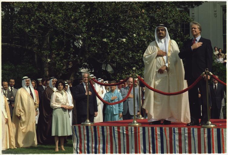 Keywords: Jimmy Carter and Prince Fahd bin Abd al-Aziz Al-Saud Crown Prince of Saudi Arabia during a welcoming ceremony at the... - NARA - 174850.tif Scope and content General notes 174850 Local identifier President 1977-1981 Carter White House Staff Photographers 01/20/1977 - 01/20/1981 Jimmy Carter Library NLJC 441 Freedom Parkway Atlanta GA 30307-1498 1977-05-24 Record group Collection JC-WHSP Carter White House Photographs Collection 01/20/1977 - 01/22/1981 Record group ARC 1120 Carter White House Photographs Presidential compiled 01/20/1977 - 01/22/1981 Series ARC 173341 File unit Welcome Ceremony for His Royal Highness Prince Fahd bin 'Abd al-Aziz Al-Saud Crown Prince and Deputy Prime Minister of the Kingdom of Saudi Arabia 05/24/1977 - 05/24/1977 File unit ARC 174849 Variant control numbers NAIL Control Number NLC-WHSP-C-01441-19 yes Other versions NARA-cooperation PD-USGov Fahd of Saudi Arabia Jimmy Carter with national leaders Relations of Saudi Arabia and the United States |