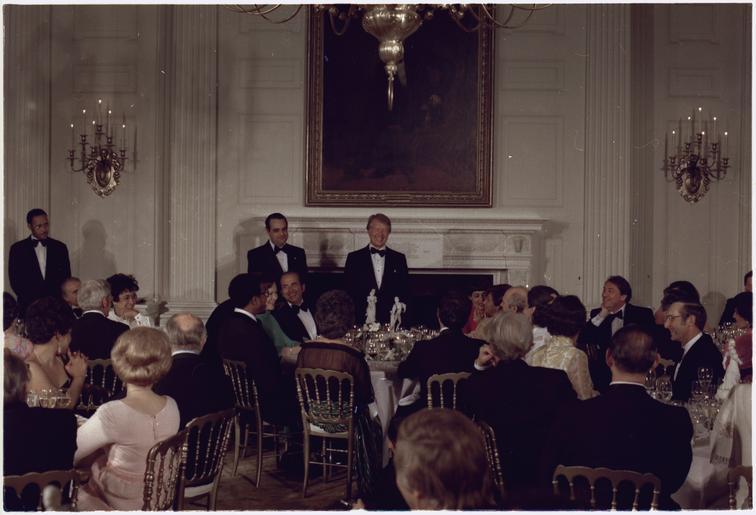 | Keywords: Jimmy Carter toasts Andre Perez President of Venezuela during a state dinner. - NARA - 175338.tif Scope and content General notes 175338 Local identifier President 1977-1981 Carter White House Staff Photographers 01/20/1977 - 01/20/1981 Jimmy Carter Library NLJC 441 Freedom Parkway Atlanta GA 30307-1498 1977-06-28 Record group Collection JC-WHSP Carter White House Photographs Collection 01/20/1977 - 01/22/1981 Record group ARC 1120 Carter White House Photographs Presidential compiled 01/20/1977 - 01/22/1981 Series ARC 173341 File unit State Dinner for the President of Venezuela 06/28/1977 - 06/28/1977 File unit ARC 175337 Variant control numbers NAIL Control Number NLC-WHSP-C-01906-9 yes Other versions NARA-cooperation PD-USGov Carlos Andrés Pérez State dinners Jimmy Carter with national leaders Relations of the United States and Venezuela |