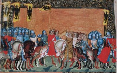 Keywords: Jitka a císař.jpg cs Jitka získává od císaře stolec aby jej postavila v Boleslavi Dalimil chronik author century 14 PD-old Medieval cavalry Chronik Dalimil Judith of Schweinfurt Medieval miniatures of horses