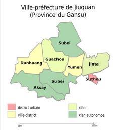 | Keywords: Jiuquan administrative divisions (French).svg en Administrative subdivision of the prefecture-level city of Jiuquan Gansu Own Zolo 2010-03-23 SVG maps of prefecture-level cities of China Jiuquan Maps of Jiuquan SVG maps in French Maps of prefecture-level divisions of China |