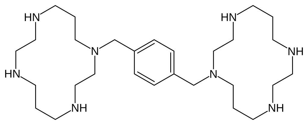 | Keywords: JM 3100.svg Skeletal formula of JM 3100 IUPAC name 1- 4- 1 4 8 11-tetrazacyclotetradec-1-ylmethyl phenylmethyl -1 4 8 11-tetrazacyclotetradecane Created using http //www acdlabs com/download/chemsk html ACD/ChemSketch 10 0 and Inkscape Own 2007-03-04 Fvasconcellos Benzene derivatives Nitrogen heterocycles Macrocyclic compounds |