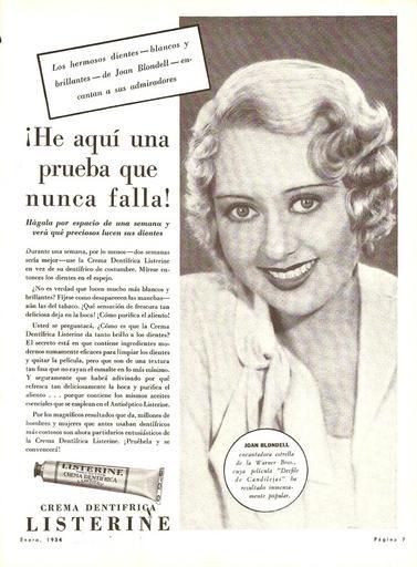 | Keywords: Joan Blondell Argentinean Magazine AD 3.jpg Publicity photo of LISTERINE TOOTHPASTE Joan Blondell for Argentinean Magazine http //cgi ebay com my/LISTERINE-JOAN-BLONDELL-Origin-Argentinean-AD-1934_W0QQitemZ370219704580QQcmdZViewItemQQptZLH_DefaultDomain_0 hash item5632d06104 1934-01 produced by LISTERINE and supplied to CINE MUNDIAL magazine PD-AR-Photo Joan Blondell Cine Mundial Advertisements in Argentina 1934 advertisements Cosmetics advertising | ||||
