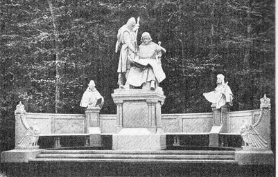 Keywords: Johann Otto Siegesallee.JPG Ehemalige Siegesallee in Berlin mit dem Doppelstandbild fĂĽr die gemeinsam regierenden Brandenburger Markgrafen Johann I 1213 “1266 und Otto III ca 1215 “1267 Söhne von Albrecht II Die Nebenfigur BĂĽste links zeigt den Propst Simeon von Cölln die Figur rechts Marsilius erster nachgewiesener Schulze SchultheiĂź und Richter von Berlin Bildhauer Max Baumbach EnthĂĽllung 22 März 1900 Der auf einem Stein sitzende Johann I hat ĂĽber seinen Knien die Urkunde ausgebreitet durch die Berlin und Cölln das Stadtrecht erhalten haben sollen Der jĂĽngere Otto III steht neben ihm und weist mit einem Arm auf die Urkunde während der andere Arm auf einem JagdspieĂź ruht Die jugendlichen StädtegrĂĽnder sind hier als reife Männer dargestellt denn zwei Knabengestalten hätten den GrĂĽndungsakt einer späteren Weltstadt aus Sicht der gängigen Geschichtsinterpretation nicht angemessen zum Ausdruck bringen können The former Siegesallee in Berlin with the double statue commemorating the corulers of Brandenburg Margrave John I 1213 “1266 and Margrave Otto III ca 1215 “1267 sons of Albert II and grandchildren of Otto II The bust on the left commemorates Provost Simeon of Cölln that on the right Marsilius de Berlin the first documented Schulze mayor and judge of Berlin Sculptor Max Baumbach The sculpture was unveiled on 22 March 1900 Spread across the knees of John I is the document granting town charters to Berlin and Cölln The younger Otto III stands beside him pointing to the charter with one arm while the other rests on a hunting spike The youthful city founders are portrayed here as mature men because in the view of contemporaries the significance of founding the later metropolis would not have been adequately manifested as an act of two youngsters Jan von Flocken Die Siegesallee Auf den Spuren der brandenburgisch-preuĂźischen Geschichte Kai Homilius Verlag Berlin 2001 ISBN 3-89706-899-0 page 88 and 1899 1900 Max Baumbach and Karl Begas sculptors Siegesallee 05 Johann I + Otto III PD-old |