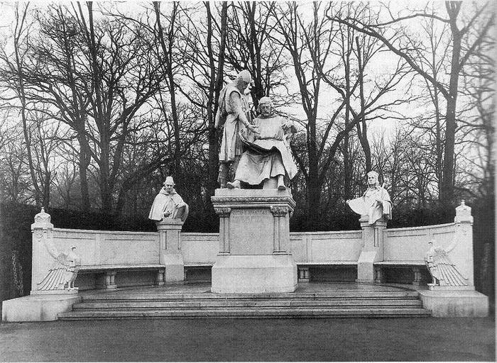 Keywords: Johann Otto Siegesallee1.JPG Ehemalige Siegesallee in Berlin mit dem Doppelstandbild fĂĽr die gemeinsam regierenden Brandenburger Markgrafen Johann I 1213 “1266 und Otto III ca 1215 “1267 Söhne von Albrecht II Die Nebenfigur BĂĽste links zeigt den Propst Simeon von Cölln die Figur rechts Marsilius erster nachgewiesener Schulze SchultheiĂź und Richter von Berlin Bildhauer Max Baumbach EnthĂĽllung 22 März 1900 Der auf einem Stein sitzende Johann I hat ĂĽber seinen Knien die Urkunde ausgebreitet durch die Berlin und Cölln das Stadtrecht erhalten haben sollen Der jĂĽngere Otto III steht neben ihm und weist mit einem Arm auf die Urkunde während der andere Arm auf einem JagdspieĂź ruht Die jugendlichen StädtegrĂĽnder sind hier als reife Männer dargestellt denn zwei Knabengestalten hätten den GrĂĽndungsakt einer späteren Weltstadt aus Sicht der gängigen Geschichtsinterpretation nicht angemessen zum Ausdruck bringen können The former Siegesallee in Berlin with the double statue commemorating the corulers of Brandenburg Margrave John I 1213 “1266 and Margrave Otto III ca 1215 “1267 sons of Albert II and grandchildren of Otto II The bust on the left commemorates Provost Simeon of Cölln that on the right Marsilius de Berlin the first documented Schulze mayor and judge of Berlin Sculptor Max Baumbach The sculpture was unveiled on 22 March 1900 Spread across the knees of John I is the document granting town charters to Berlin and Cölln The younger Otto III stands beside him pointing to the charter with one arm while the other rests on a hunting spike The youthful city founders are portrayed here as mature men because in the view of contemporaries the significance of founding the later metropolis would not have been adequately manifested as an act of two youngsters Uta Lehnert Der Kaiser und die Siegesallee RĂ©clame Royale Dietrich Reimer Verlag Berlin 1998 ISBN 3-496-01189-0 page 114 and 1899 1900 Max Baumbach and Karl Begas sculptors Siegesallee 05 Johann I + Otto III PD-old |